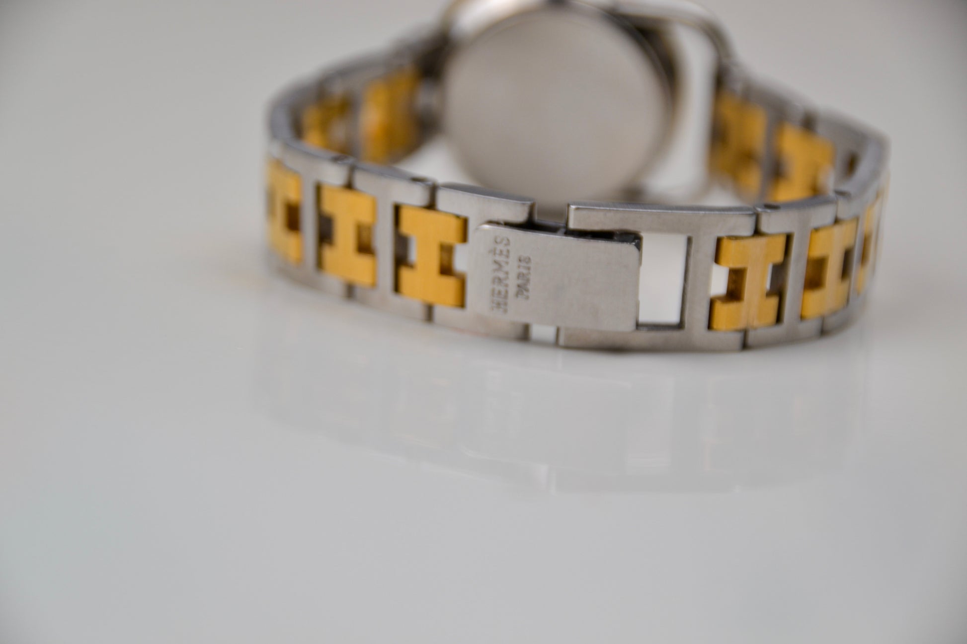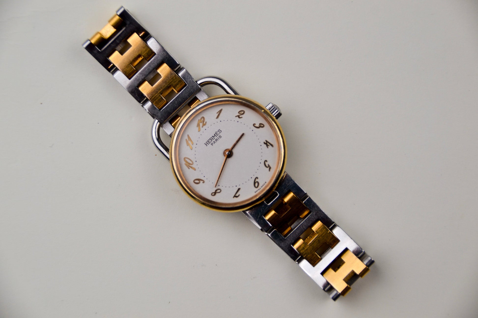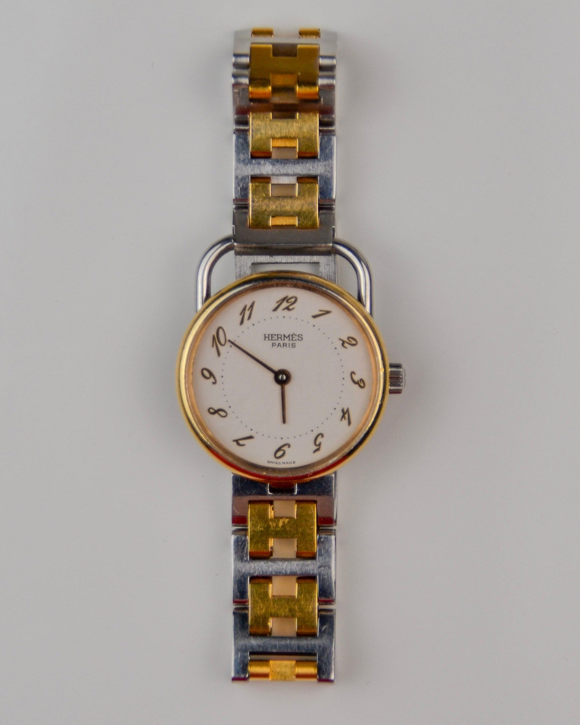 Recently serviced (February 2026) and presenting in good vintage condition. The case has been previously polished, and light oxidation is present on the interior of the bracelet. The watch comes with the original Hermès box and papers. Made in Switzerland.